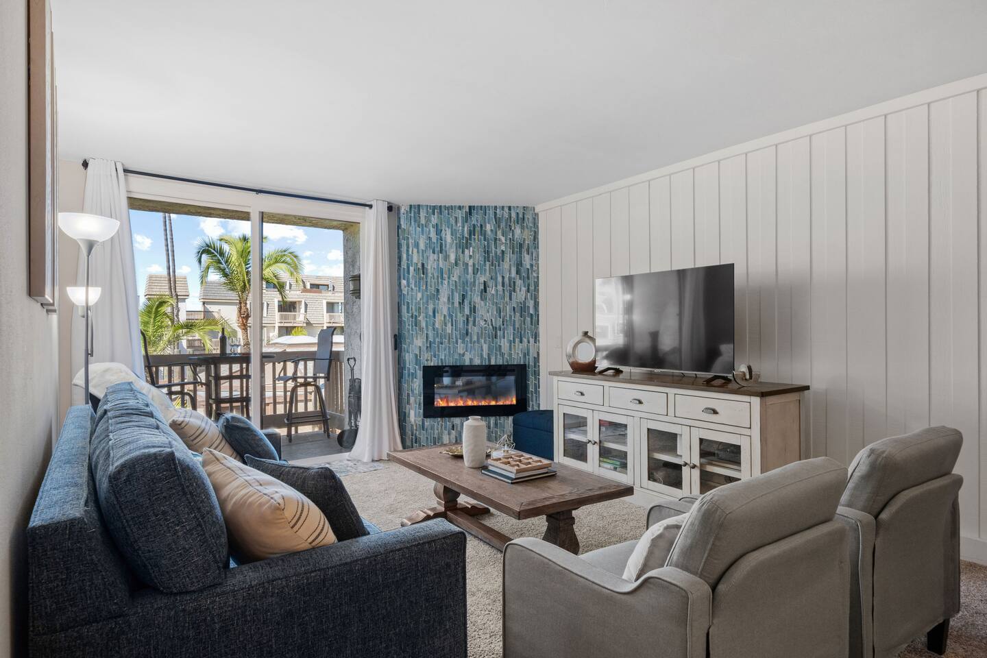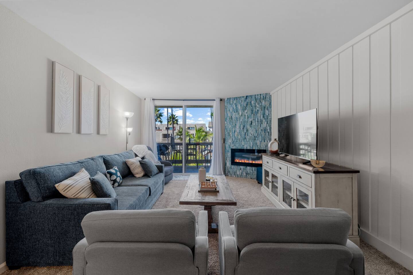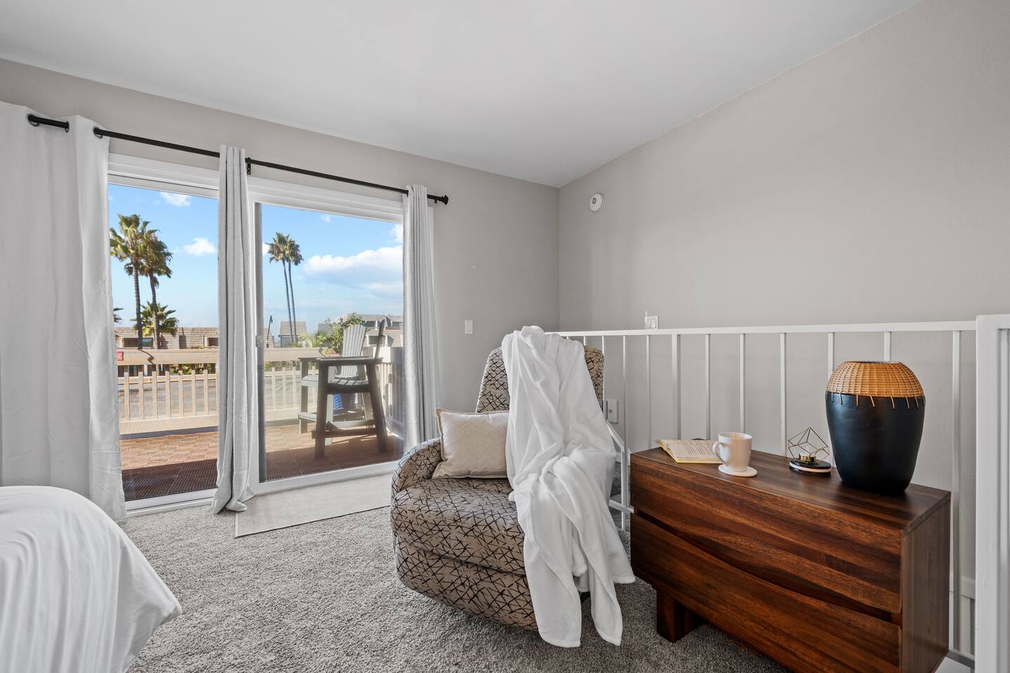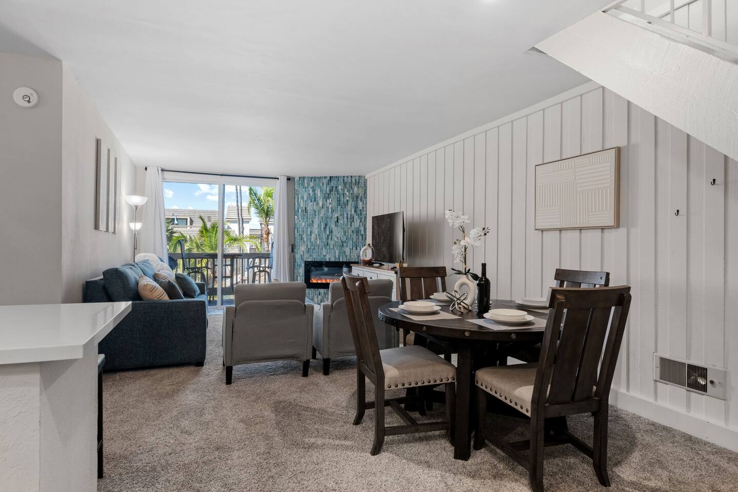 Welcome to Cozy Shell Villa at North Coast Village Escape to Cozy Shell Villa, a bright and tranquil two-story beachfront penthouse level tucked inside the lush, gated community of North Coast Village — one of the most desirable locations on the Oceanside shoreline. Just steps from the sand and a short walk to both the Pier and Harbor, this upper-level villa blends coastal charm with thoughtful comfort for families, couples, and work-from-anywhere travelers. From the moment you arrive, you’ll feel like you’ve entered your own private beach retreat. Towering palms, koi ponds, and waterfalls surround you as you stroll through the tropical gardens toward Building C (located in the middle for convenience and easy access). Inside, our home welcomes you with airy vaulted ceilings, stylish coastal décor, and spaces designed to unwind, reconnect, and recharge. The Space 2 bedrooms + sofa bed | 2 full bathrooms | 2 balconies The open living area invites you to sink into plush seating, stream your favorite shows on the flat-screen TV, or simply listen to the waves in the background. Open patio door or windows for some natural light and ocean breezes. Gourmet Kitchen – Fully stocked with everything you need: stainless-steel appliances, coffee station, blender, toaster, cookware, bakeware, and serving pieces. Whether you’re blending smoothies for the beach or hosting a family dinner, it’s all here. Dining & Gathering – A table for four (or extended it and add 2 extra chairs) plus breakfast-bar seating for two keeps everyone connected during meals or game night. Primary Loft Suite – Upstairs, the semi-private loft features a California King bed, ensuite bathroom with tub/shower, dresser space, and a balcony perfect for sunrise coffee or sunset wine. A walk-in closet has been converted into a flex workspace or baby room, complete with desk, chair for quick light work—or space for a pack-and-play. Lower-Level Bedroom – Serene retreat with Queen bed, blackout curtains, and spacious double closets stocked with extra linens, blankets, steamer, and beach towels. Bathrooms – Two full baths (one upstairs, one down) each stocked with plush towels, shampoo, conditioner, body wash, hair dryer, and thoughtful touches. Extras – Fast Wi-Fi, convenient USB charging outlets, ceiling fans throughout, wall heaters for cool evenings, and two furnished balconies for fresh coastal air. Please note: Condo it not equipped with air conditioners so multiple fans including ceiling fans are located throughout for comfort. Resort Amenities Your stay includes access to all the North Coast Village amenities: - Two resort-style pools & grotto-style hot tubs - Sauna & fitness center (ages 14 +) - Game & recreation rooms with ping-pong and billiards - Putting greens & tropical gardens with koi ponds - Outdoor BBQ stations and picnic areas - Community with 24-hour patrol - Direct beach access just steps from your building Parking & Access You’ll have one assigned garage space (#5-43) in Dolphin Cove garage. The HOA front desk provides your key fob and map at check-in (Patrol will continue to check in for after-hours arrivals). Additional paid parking is available nearby. Thoughtfully Hosted We’ve stocked the villa with everything we look for when traveling as a family: comfortable linens, extra beach towels, steamer, board games, and even a few local insider tips in your digital guide. Whether you’re planning a beach weekend, romantic escape, or an extended stay by the sea, Cozy Shell Villa offers comfort, convenience, and a touch of coastal magic you’ll want to revisit year after year.