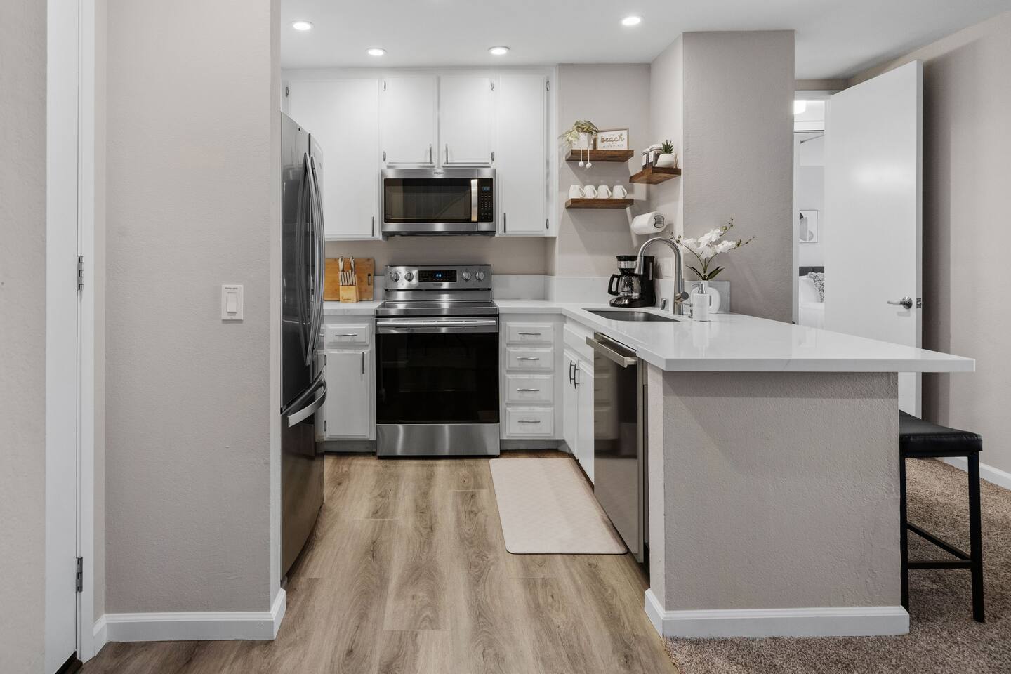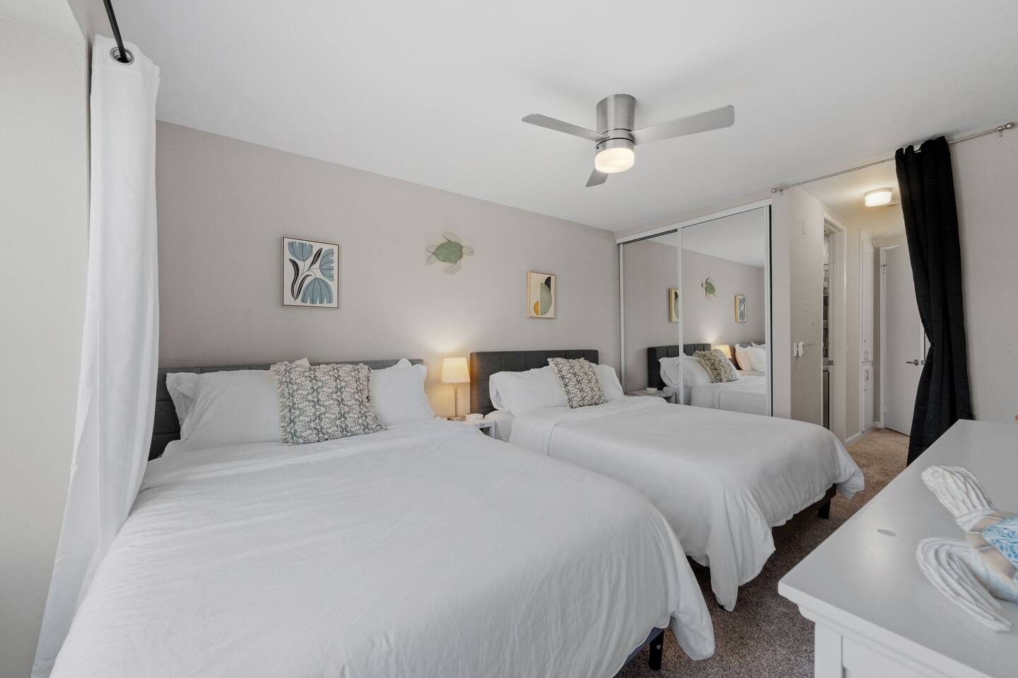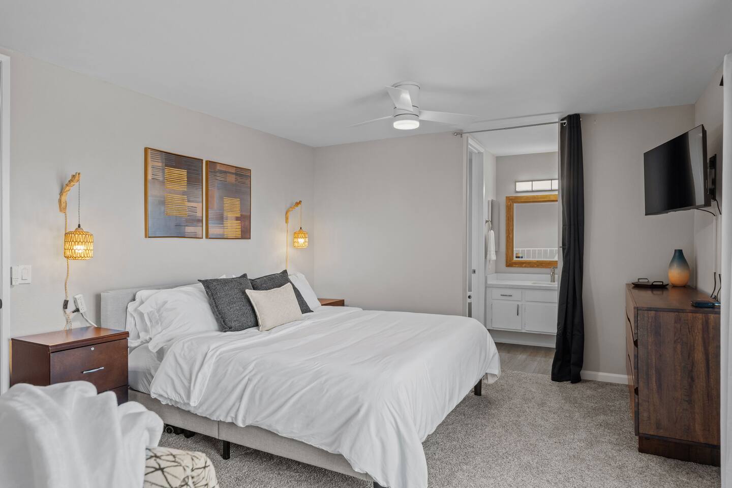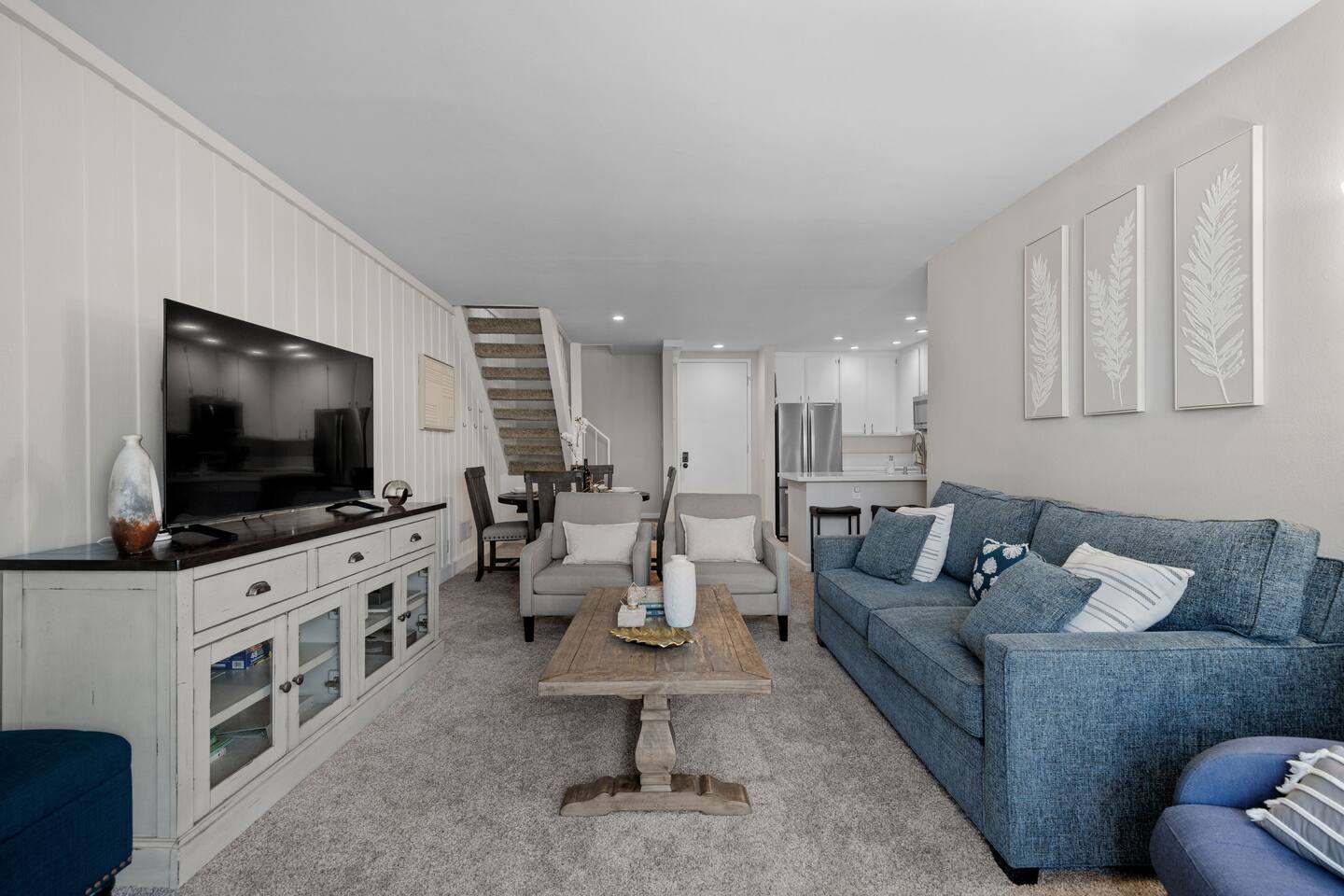 Welcome to Cozy Shell Villa at North Coast Village Escape to Cozy Shell Villa, a bright and tranquil two-story beachfront penthouse level tucked inside the lush, gated community of North Coast Village — one of the most desirable locations on the Oceanside shoreline. Just steps from the sand and a short walk to both the Pier and Harbor, this upper-level villa blends coastal charm with thoughtful comfort for families, couples, and work-from-anywhere travelers. From the moment you arrive, you’ll feel like you’ve entered your own private beach retreat. Towering palms, koi ponds, and waterfalls surround you as you stroll through the tropical gardens toward Building C (located in the middle for convenience and easy access). Inside, our home welcomes you with airy vaulted ceilings, stylish coastal décor, and spaces designed to unwind, reconnect, and recharge. The Space 2 bedrooms + sofa bed | 2 full bathrooms | 2 balconies The open living area invites you to sink into plush seating, stream your favorite shows on the flat-screen TV, or simply listen to the waves in the background. Open patio door or windows for some natural light and ocean breezes. Gourmet Kitchen – Fully stocked with everything you need: stainless-steel appliances, coffee station, blender, toaster, cookware, bakeware, and serving pieces. Whether you’re blending smoothies for the beach or hosting a family dinner, it’s all here. Dining & Gathering – A table for four (or extended it and add 2 extra chairs) plus breakfast-bar seating for two keeps everyone connected during meals or game night. Primary Loft Suite – Upstairs, the semi-private loft features a California King bed, ensuite bathroom with tub/shower, dresser space, and a balcony perfect for sunrise coffee or sunset wine. A walk-in closet has been converted into a flex workspace or baby room, complete with desk, chair for quick light work—or space for a pack-and-play. Lower-Level Bedroom – Serene retreat with Queen bed, blackout curtains, and spacious double closets stocked with extra linens, blankets, steamer, and beach towels. Bathrooms – Two full baths (one upstairs, one down) each stocked with plush towels, shampoo, conditioner, body wash, hair dryer, and thoughtful touches. Extras – Fast Wi-Fi, convenient USB charging outlets, ceiling fans throughout, wall heaters for cool evenings, and two furnished balconies for fresh coastal air. Please note: Condo it not equipped with air conditioners so multiple fans including ceiling fans are located throughout for comfort. Resort Amenities Your stay includes access to all the North Coast Village amenities: - Two resort-style pools & grotto-style hot tubs - Sauna & fitness center (ages 14 +) - Game & recreation rooms with ping-pong and billiards - Putting greens & tropical gardens with koi ponds - Outdoor BBQ stations and picnic areas - Community with 24-hour patrol - Direct beach access just steps from your building Parking & Access You’ll have one assigned garage space (#5-43) in Dolphin Cove garage. The HOA front desk provides your key fob and map at check-in (Patrol will continue to check in for after-hours arrivals). Additional paid parking is available nearby. Thoughtfully Hosted We’ve stocked the villa with everything we look for when traveling as a family: comfortable linens, extra beach towels, steamer, board games, and even a few local insider tips in your digital guide. Whether you’re planning a beach weekend, romantic escape, or an extended stay by the sea, Cozy Shell Villa offers comfort, convenience, and a touch of coastal magic you’ll want to revisit year after year.